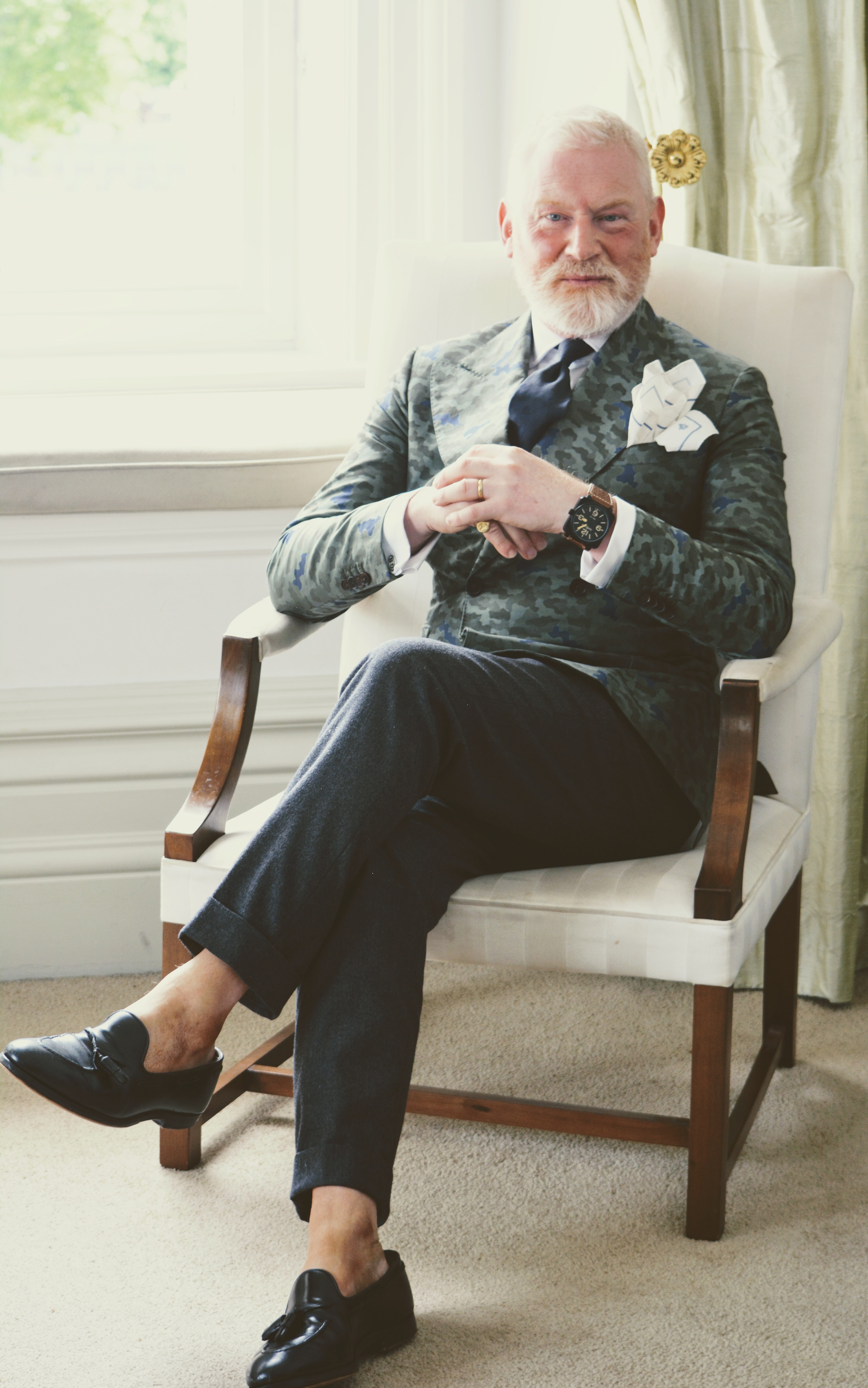 I’ve been particularly interested in camouflage for a number of years now. I think it is because if works so well with formal suits creating that ‘Sprezzatura’ look that I am always chasing. I’m not so fond of being too perfect, breaking a suit up with a camouflage jacket helps to create a sense of confusion and challenge what dressing is about, which I am very keen on. Camouflage also goes so well with reds and pinks which are probably my signature trouser colour. For each camouflage piece I own, I always try and pair it with something more formal. My favourite look nearly six years ago now was to pair camouflage combat trousers with suede crocket and jones snuff loafers, pink striped shirt, Ralph Lauren bowtie and a 6 button double breasted blazer. It was in my opinion such a fab look and so unexpected to see the very formal blazer wickedly contrasting the camouflage combats, and loafers, sockless of course! Since this time, I’ve extended my camouflage wardrobe to include one very fitting cotton camouflage double breasted jacket. I had this made as I wanted to show my children that jackets and suiting could look fabulous and great style didn’t have to be restricted to a very traditional look. I must say it was great to turn up to the school performance making a statement rather than wearing the standard dad kit, each to their own I think. More recently I’ve bought a camouflage field jacket that looks super with orange corduroys. I think it goes back to the idea of matching colours on one hand and also breaking the traditional of what people might expect a gentleman to wear. Being the keen observer of style that I am, I’ve noticed that it isn’t only men but women are also recognising that camouflage is a fabric that just can’t be ignored right now. I’m not sure if we’ve reached peak-camouflage or not, maybe it’s always been around and will always be. Nonetheless even if I stop wearing my super double breasted camouflage jacket, it will be neatly stored for when my boys hit size 38R, because I know they’ll love it as wear it as much as I.
